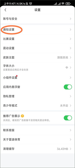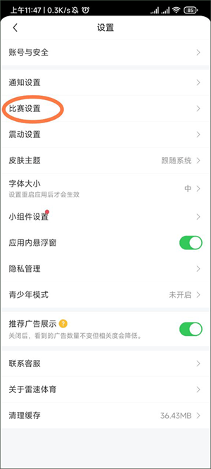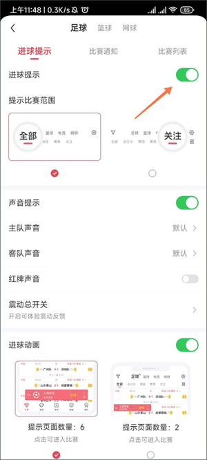 5、提醒设置:除了夜间免打扰模式,还提供个性的比赛提醒;