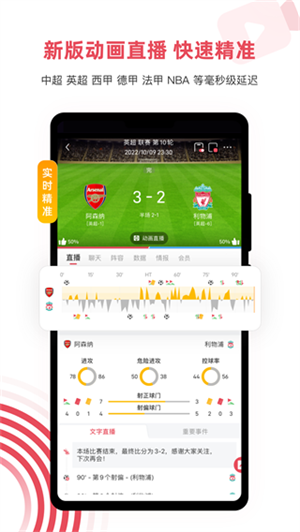动画直播能准确即时还原赛场战况,战报集锦快速精准。一旦比分改写,就会及时告知你钟爱的球队以及关注比赛的比分,确保你不会错过任何一场精彩赛事。