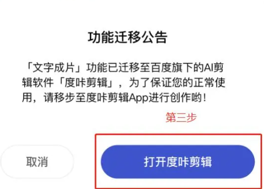 跳转至图文页面后会看到发布内容后方的“一键成片”,点击该按钮。会提示“打开度咔剪辑”点击前往即可。