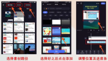 点击剪辑按钮,这里可以给视频添加画中画。素材可以添加手机相册中的图片或视频,也可以添加素材库中的图片、视频,这里也可以添加百度网盘里的素材内容。选择好素材点击“添加”即可,长按视频中添加的画中画素材可以随意调整图片的大小和位置。拖动下方的进度条可以调整画中画素材的长度。