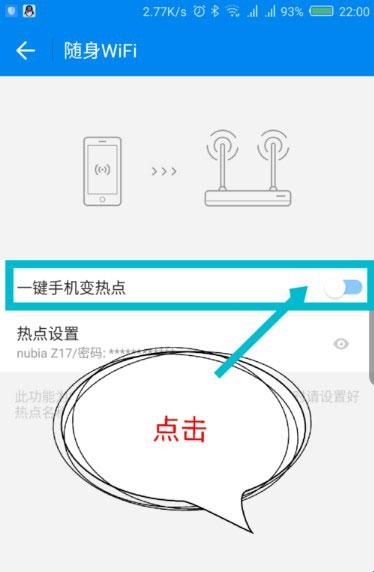 2、点击手机图标后,打开随身WiFi的界面,点击下面的一键手机变热点选项。