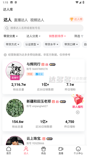2. 来到达人页面,你能够依据自身需求的分类,挑选想要了解的达人详细信息。