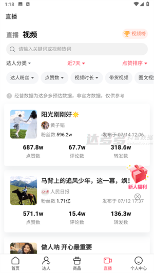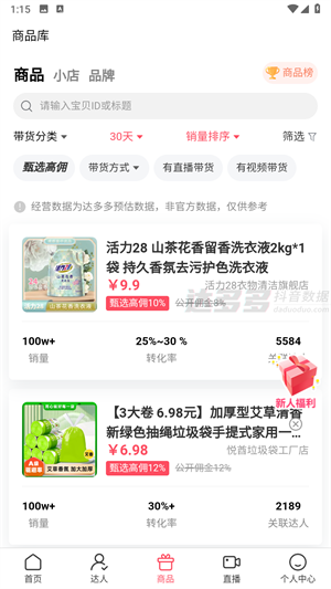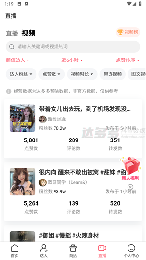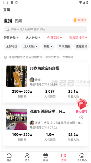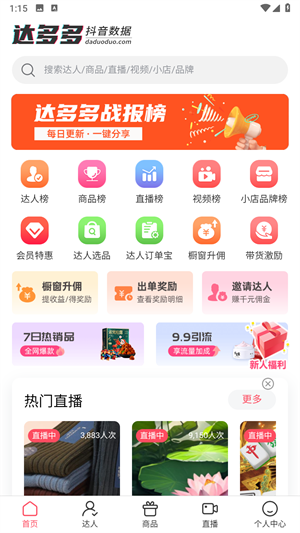 达多多作为专业的抖音数据分析平台,能让你随时在线查看抖音直播的数据分析,带来全面的直播数据展示。在这里,用户不仅可以发现众多爆款商品,还能通过直观详细的数据展示,找到热门直播间。多维数据在此呈现,助你更好地查看数据榜单,了解热门商品信息。这是一款专为抖音直播达人打造的实用工具。