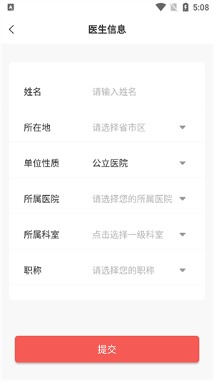 2、输入自己的姓名、所在地址、所属单位/科室、职称,点击提交即可以医生的身份登录。