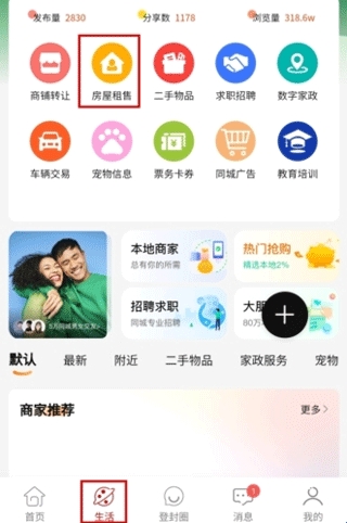 1、在生活页面中找到要删除的帖子的板块,小编就是分布了房屋租售的帖子