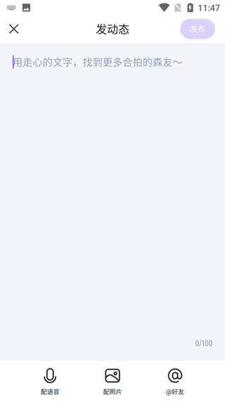 3、支持发布语音动态、照片、视频等各类动态。大家可先填写想要发布的文字,接着选择搭配照片,或者在本地相册中点击选取自己的视频作品。