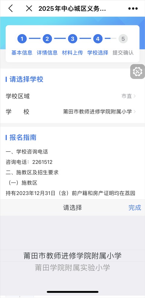 7.选择报名学校:选择报名学校所在的县区(市直、城厢、荔城、涵江、秀屿、仙游、湄洲岛、北岸),再选对应的学校,同时可查看该校招生政策。
