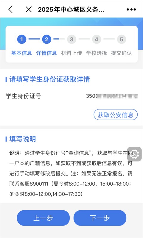 4.获取学生信息:若自动获取到学生信息,可选择同户学生,然后点击获取公安信息;若未获取到,手动输入学生身份证号后,点击获取公安信息,进入下一步。