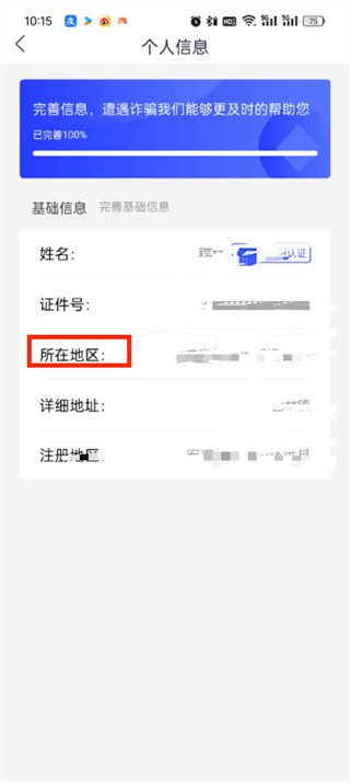3、接着来到个人信息的页面中可以查看到姓名、证件号、所在地区、详细地址、注册地址,我们点击【所在地区】;