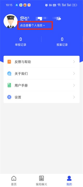 2、然后在我的页面中可以查看到举报记录、报案记录,我们需要点击【个人信息】;