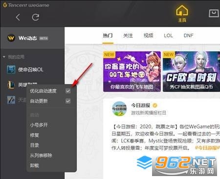 2、右键单击左侧“英雄联盟”,去掉启动优化速度后面的对钩。