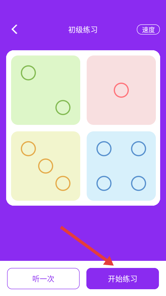 2、在初级练习界面,可先点【听一次】熟悉内容,再点【开始练习】,正式开始练习。