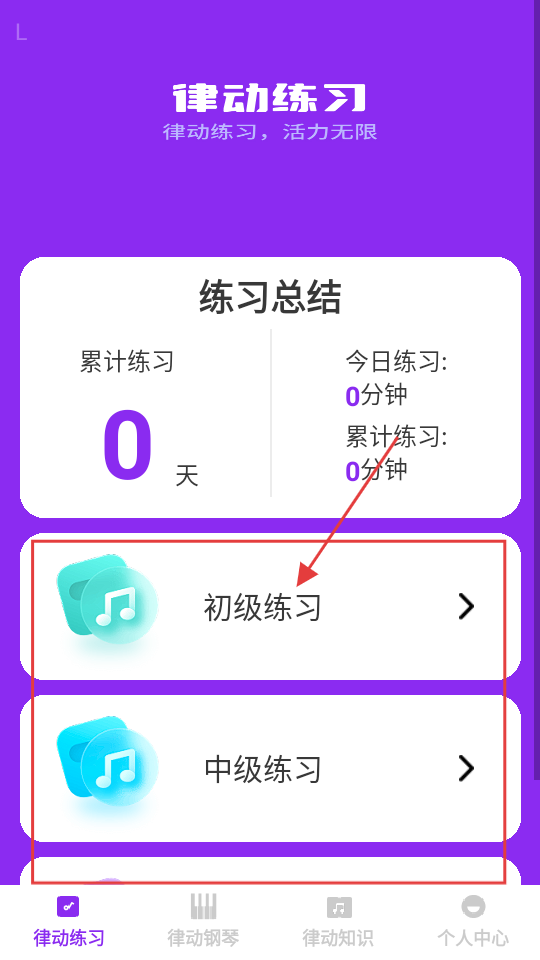 1、在律动练习页,有【初级练习】【中级练习】等选项,选【初级练习】,进入初级练习界面。
