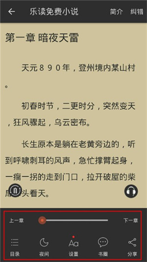 3、点击屏幕即可呼出菜单,可以在目录跳到自己想看的章节,夜间模式以及一键听书;