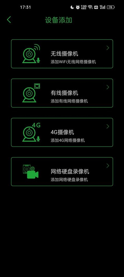 3、之后选择你需要添加的设备,根据你摄像头的类型进行添加,这里有无线摄像机、有线摄像机、4g摄像机、网络硬盘录像机这四种类型的设备;