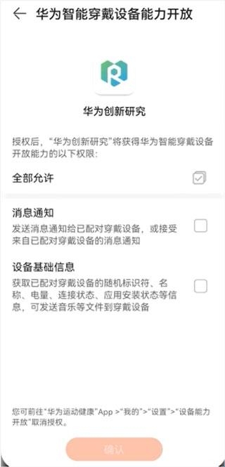 5、点击“授权提示,跳转至“华为智能穿戴设备能力开放”界面,按需勾选,点击“确定”。