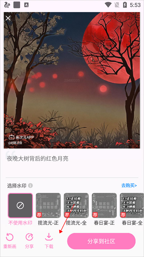 7.查看作品时,你可以进行重画、二次加工、免费下载、分享等操作。例如,免费下载的作品图像会保存在你的手机相册中。