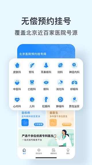 北京医院预约挂号网是一款非常方便的线上预约挂号就诊的软件。对于需要就诊的用户们可以直接的在软件上选择自己预约的科室,软件上会及时的进行推送相关专业的医生,非常的便捷。在软件上也是具有先关疾病的科普让用户们了解到一些健康的知识,提升自己的健康意识。