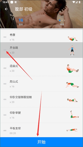 2、长按如图所示的图标可以调换训练顺序,一切更改完成后,点击“开始”即可跟随健身;