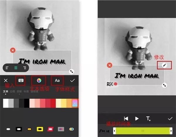 如图左所示,在「文本选项」里,能够对文本颜色、边框、阴影、标签等进行修改,点击「打钩」符号便可完成。修改字幕的大小、位置以及播放时长的操作,与上述修改贴纸的操作一致。