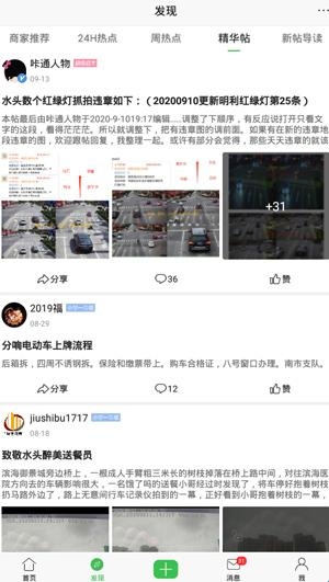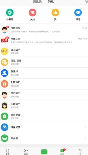 1、在本站下载安装水头在线app,运行软件,可以看到有首页、发现、消息、我四个板块;