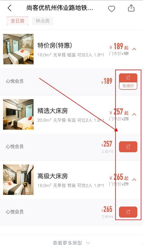 然后用户就可以选择自己要预定的房型,选择好点击右边的“订”即可。