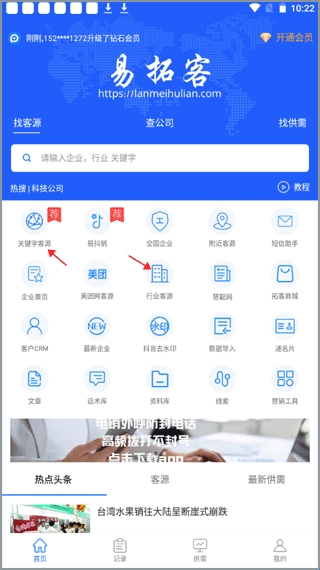 易拓客专注于提供全国各行业的客源信息挖掘,已经成为全国各行业业务员和老板们的找客户拓客神器,为各行业的老板、批发商、经销商、渠道商、销售人员提供精准客源服务。易拓客app拥有关键字企业查询,全行业企业查询,附近客源查询,供需求查询等多项功能,可以帮助您快速完成您的每一个需求,让您让有效的找到精准客户,拓客能力提升。