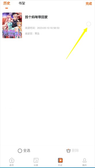 3、点击后仅可进入编辑页面,选择想要取消收藏的漫画点击后面的圆框;