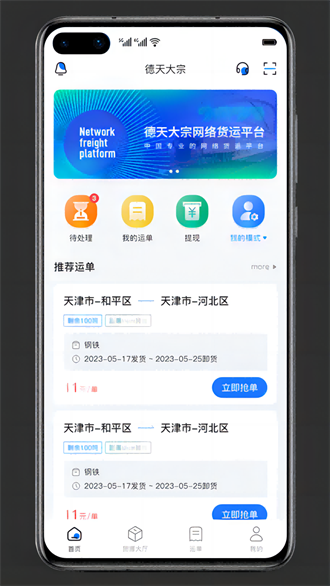 德天大宗app是提供司机线上抢单的运输办公平台,专业的在线货运服务平台,提供大量运单、丰富的货源,接单、抢单都很方便,可以随时查看运单状态,为司机、货主、客户带来更便捷的货运服务,提供大量运单,货源丰富,轻松接单抢单,并随时查看运单状态,为司机、货主、客户带来更便捷的货运服务。