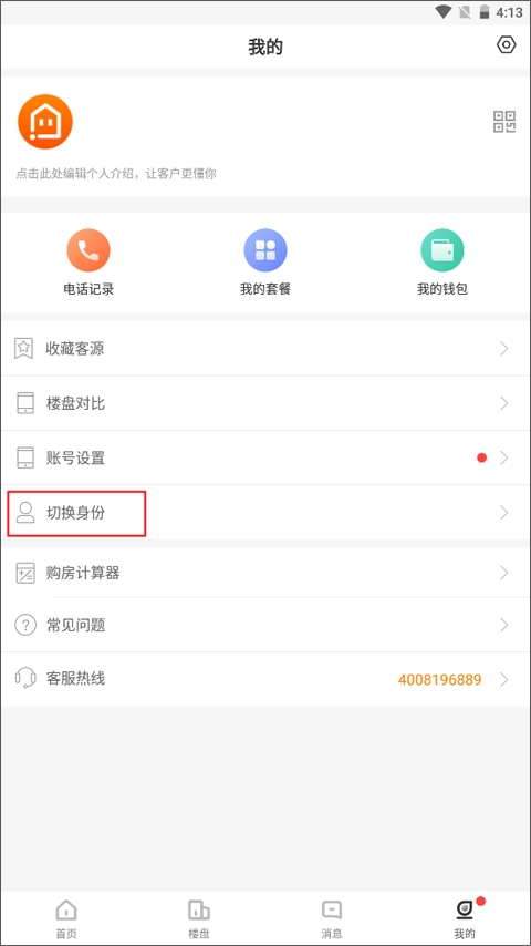 1、选择下方菜单栏【我的】界面,点击上方的“切换身份”功能按钮。