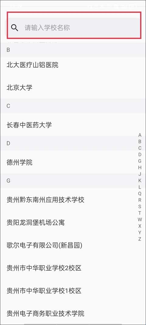 1、打开app之后,第一步就是选择校区,输入你所在的学校,选择好后就可以进行第二步了。