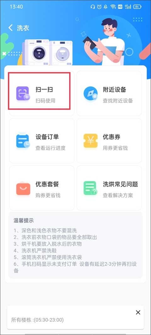 通过手机APP或小程序在线预约空闲洗衣机,无须费时排队等候。