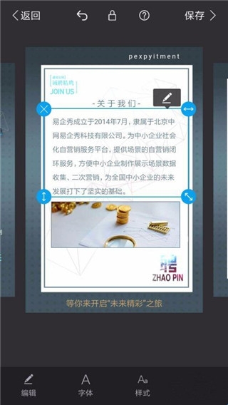4、根据自己的需要,编辑内容,模板里面的文字和图片都是可以编辑的,编辑完成之后编辑右上方的保存按钮。