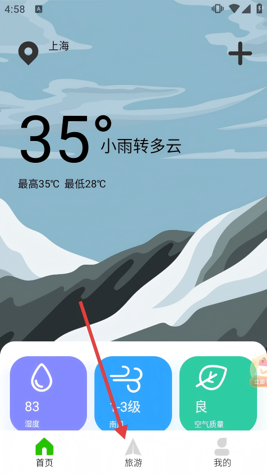 1. 于首页位置,点击底部的【旅游】选项,即可进入旅游页面。