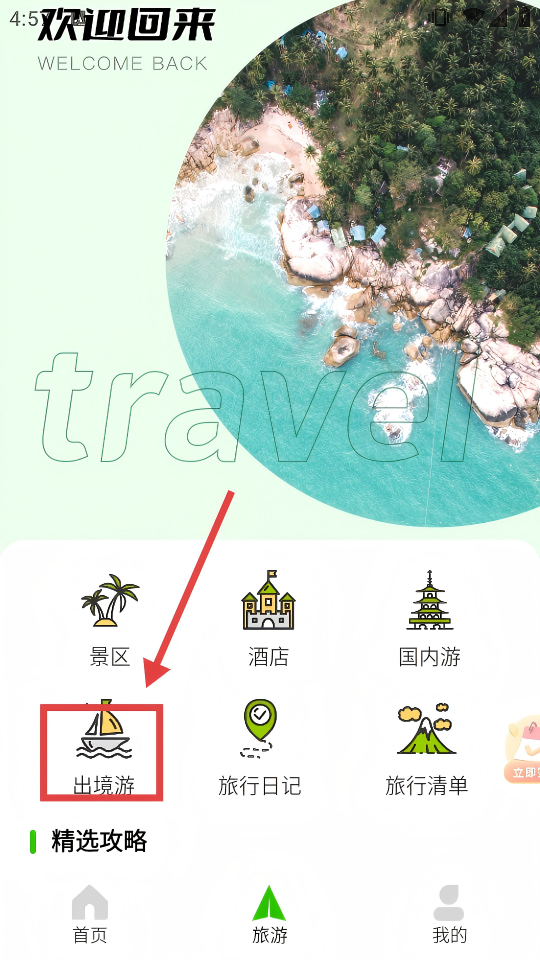 2、在旅游页面,点击【出境游】,进入出境游攻略列表页面。