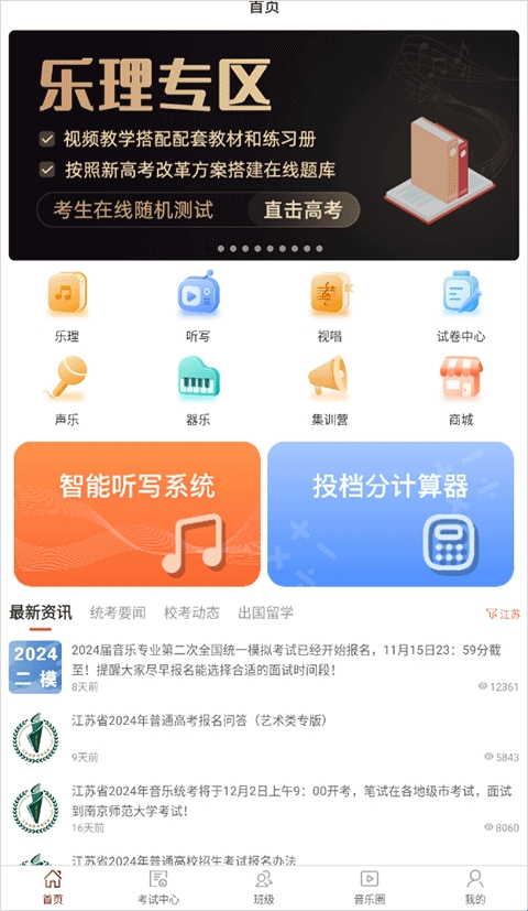 1、在首页可以看到关于乐理的教学版本以及最新的报名、考试资讯;
