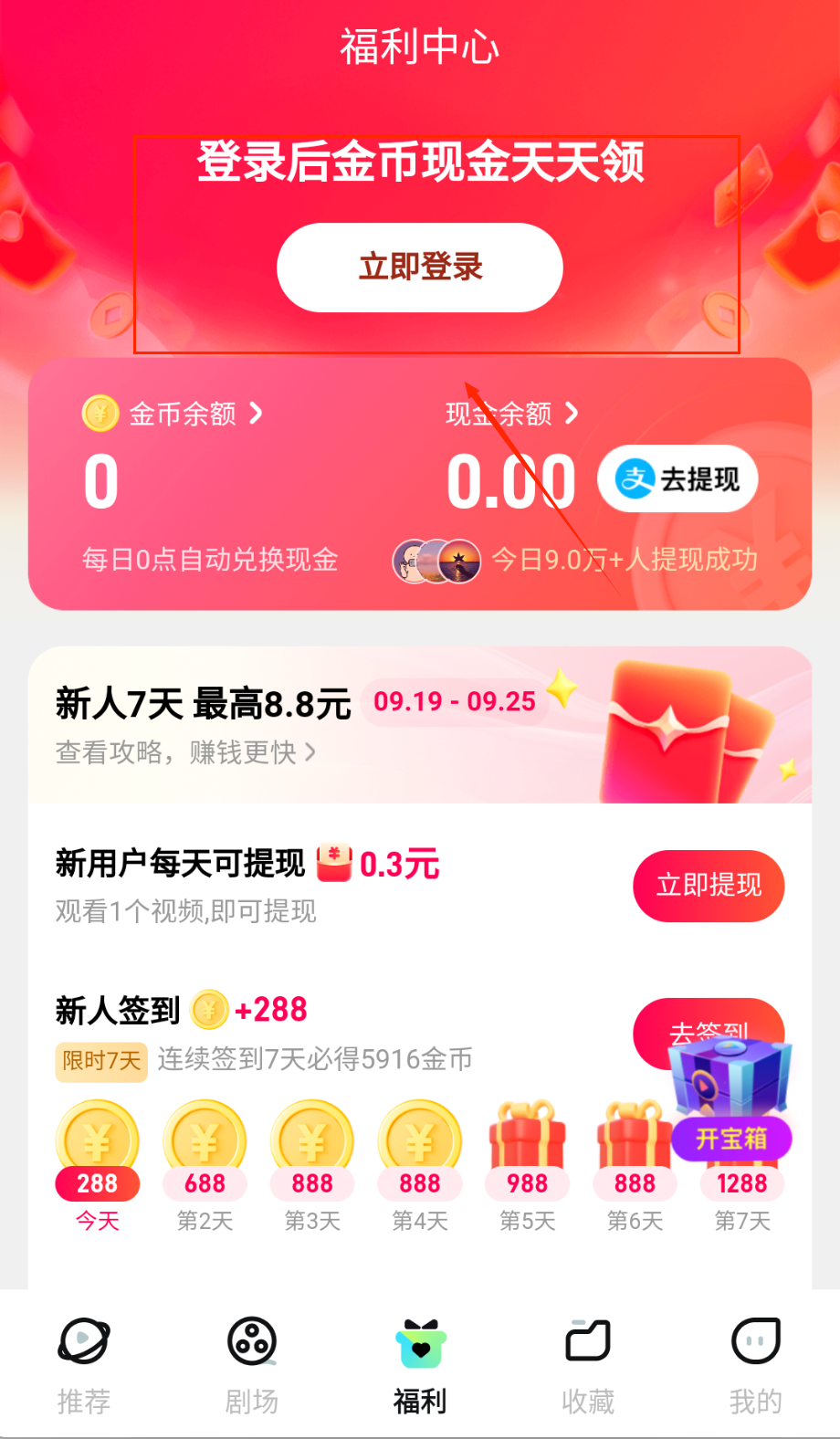 3、福利中心记得每日签到和做任务,登录后能领金币兑换现金,新人连续签到7天可得大量金币,观看视频也可提现。