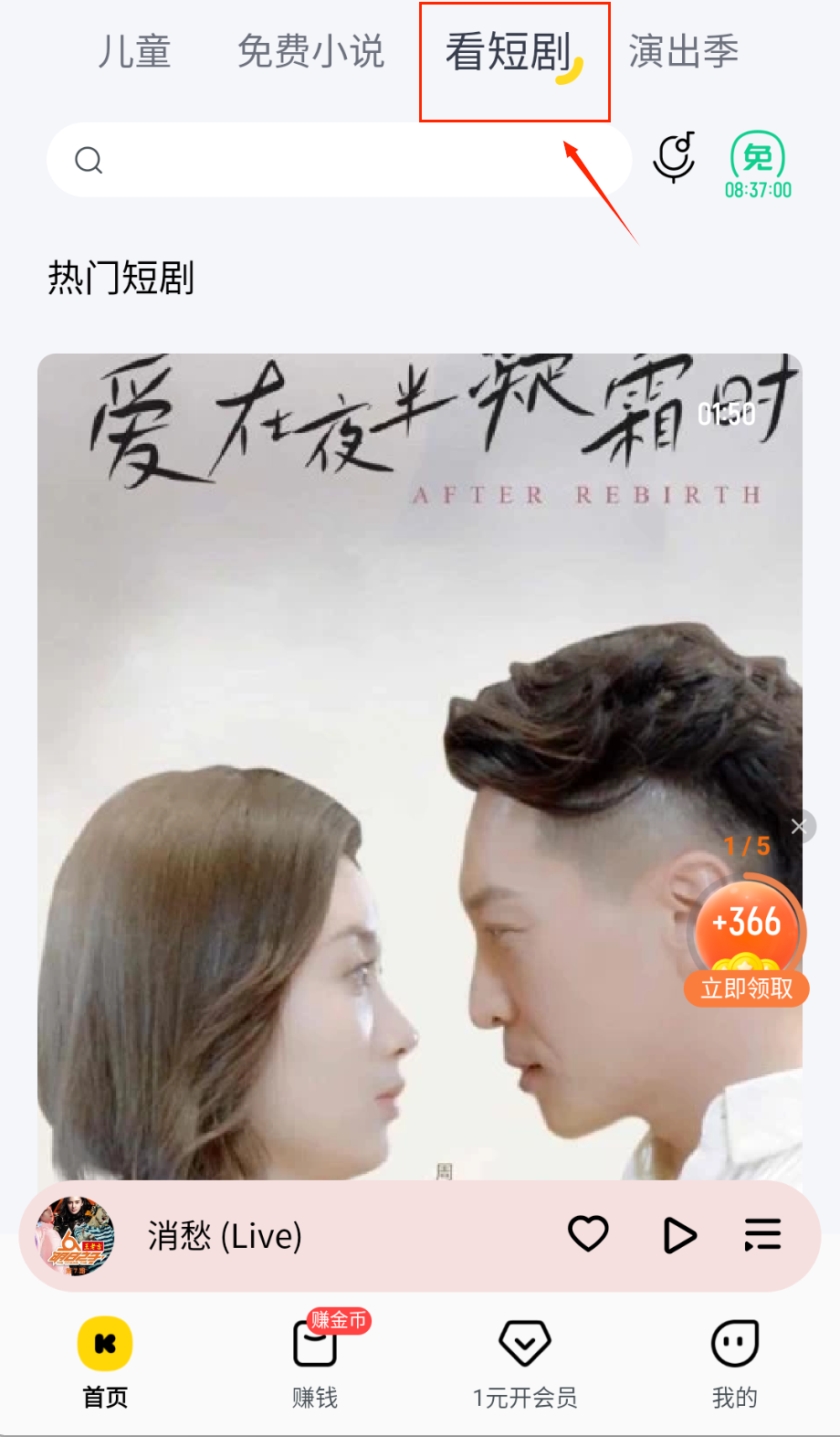 1、除了听歌,软件还提供了“看短剧”功能,在导航栏找到这个入口,里面有很多热门短剧可以免费观看,适合闲暇时放松心情。