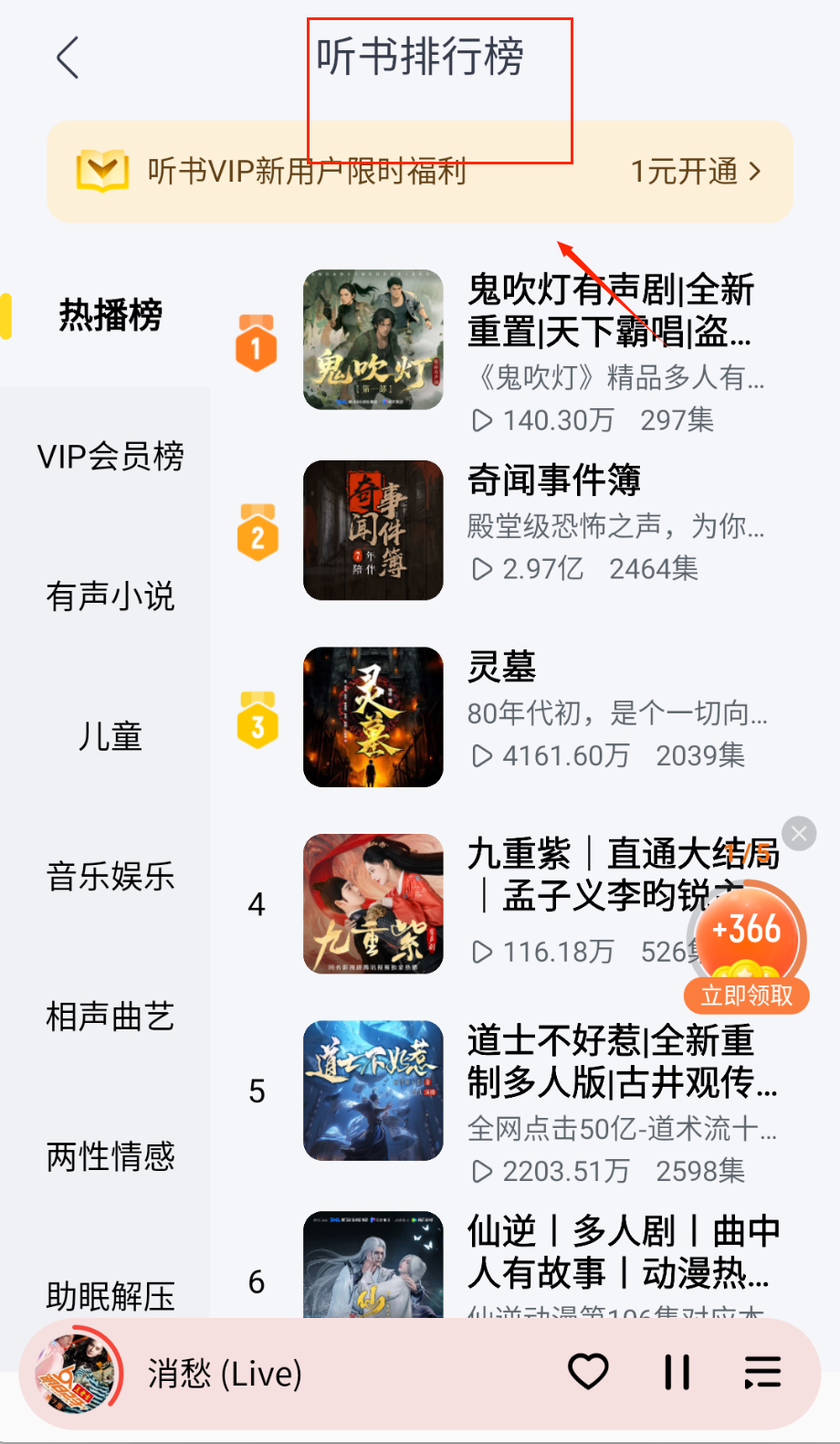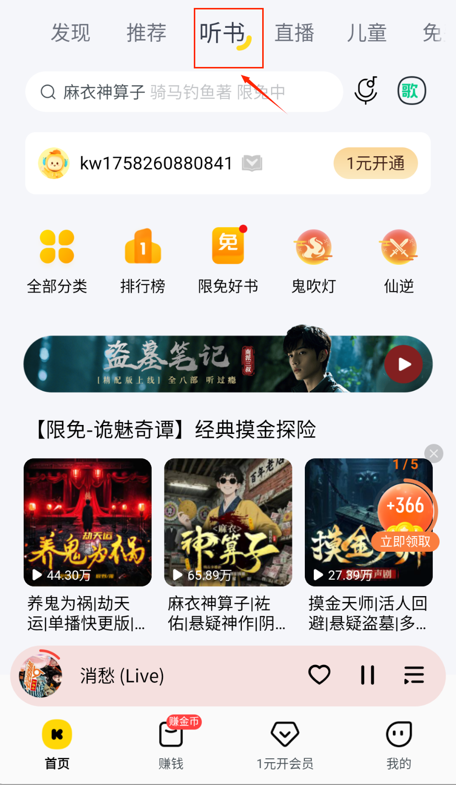 1、在“听书”或“全部分类”页面,你可以找到海量有声内容,比如热门小说“剑来”或“盗墓笔记”,直接点击就能收听,还能按分类筛选。