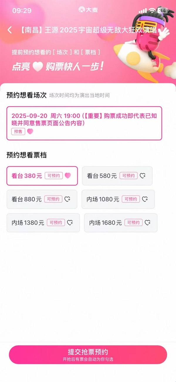 3、选择想看的票档,然后提交抢票预约