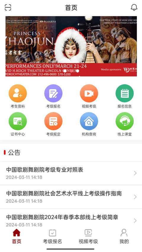 中国歌剧舞剧院在线报名系统,在线视频考级系统。学生或学生家长下载本应用,注册并提交报名信息。缴费后可以选择在线考级或现场考级。在线考级录制相应考级视频。上传视频后等待审核验证。
