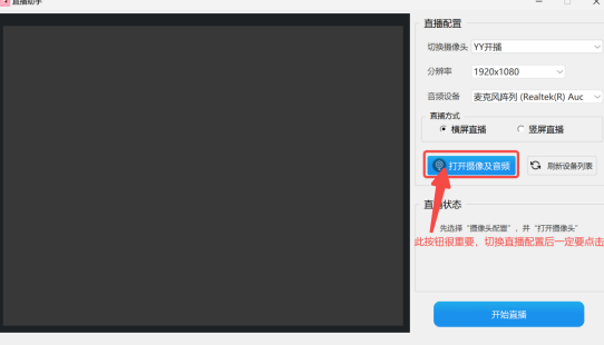 3、进入直播助手弹窗,切换摄像头,选择分辨率,选择音频设备,选择直播方式;每次上述要素选择完成后,一定要点击一次【打开摄像及音频】按钮。