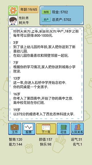 每一年都要自己努力升属性,建议投胎投父母至少,有一个收入条满50%的。