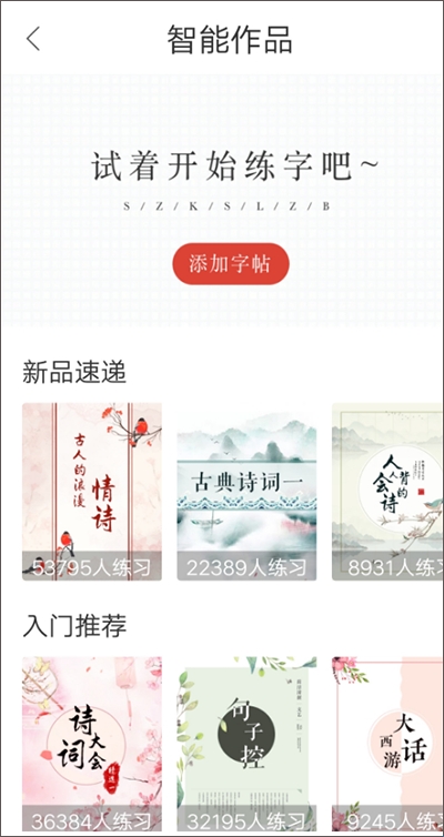 3、在【智能作品】页面内,点击选择喜欢的字帖进入练习