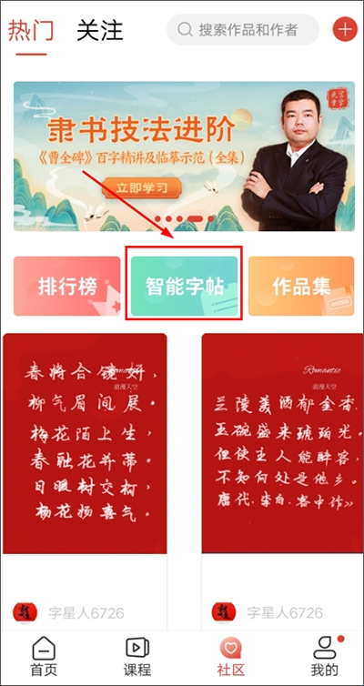 2、进入【社区】页面,点击页面内的【智能字帖】