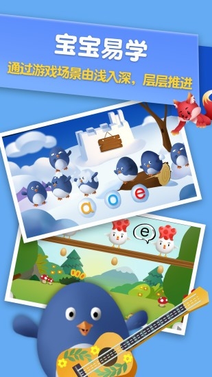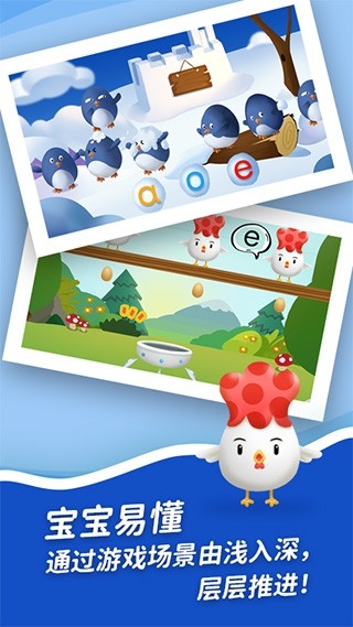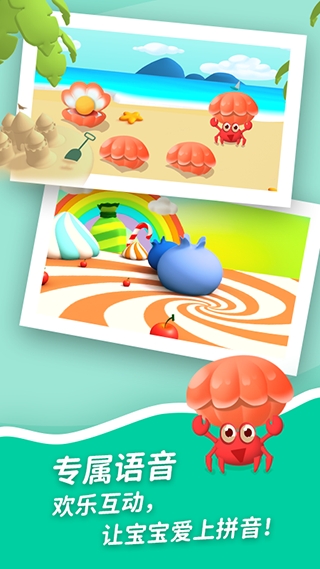 4、[寓教于乐]生动的游戏中教学,通过游戏的场景变化和偶像载体进化的模式由浅入深,层层推进,通过早教游戏让宝宝爱上学拼音。