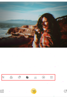 1、一开始点进软件就可以跳出拍照界面,总共有七个功能,最常用的就是第一个导入自己的照片直接生成滤镜效果和第四个闪光灯效果,如果晚上或者室内光线不好的情况下拍摄就必须得开闪光灯。剩下的功能还包括双重曝光、定时拍照、切换前后置、相机选择、色温调节、放大倍数调节、拍照建。
