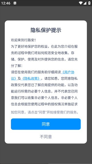 先把行路安 APP 下载到手机上,安装完成后打开软件。打开时会弹出用户协议相关提示,点击“同意”,就能顺利进入 APP 主页面啦。
