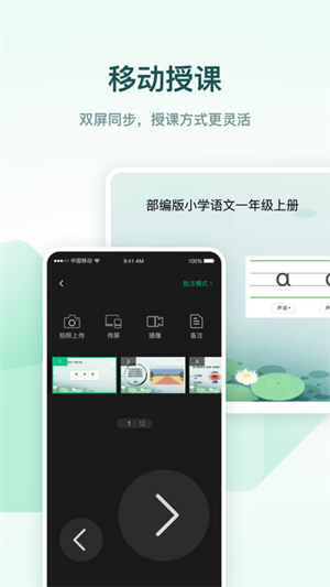 1、手机控制大屏:手机和电脑登录相同账号,就可以实现双屏同步,使用手机控制课件翻页、手机批注大屏同步显示等更多样的移动授课方式让老师自由掌控。