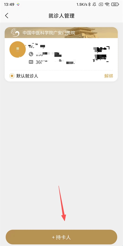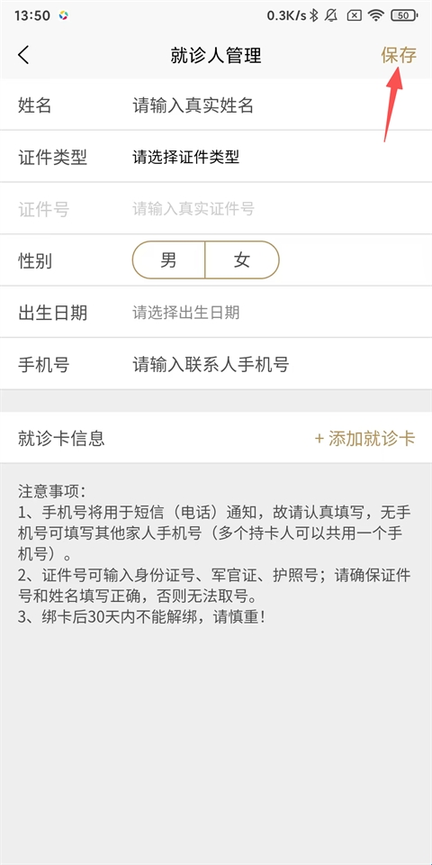 4、输入就诊人姓名、身份证号、手机号以及就诊卡等,完成后点击右上角【保存】即可完成绑定。